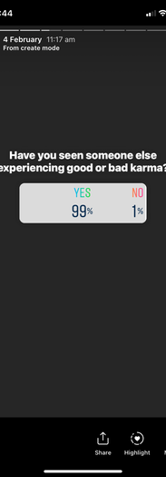 Facebook is also one of the most famous social media platforms today. Therefore, I expanded my research into Facebook as well. I shared the same Instagram poll stories on Facebook and around 70 - 93 users participated in this research. The participants on Facebook were mostly much more mature adults than the participants on Instagram. However, the participants who agreed to share their real-life karma stories were difficult to get in contact with as they were busy adults. Click the below images to view the results of the research.
